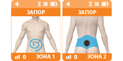 Одна из программ коррекции пищеварительных нарушений при функциональном запоре и синдроме раздраженного кишечника, при курсовом лечении геморроя. Воздействие проводится в проекции кишечника по часовой стрелке (зона 1) и в пояснично-крестцовой зоне (зона 2). Программа может применяться «по требованию» или курсом, сочетается с другими пищеварительными программами.