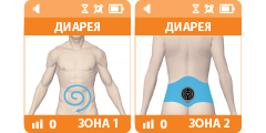 Одна из программ коррекции пищеварительных нарушений при отравлении, функциональной диарее и синдроме раздраженного кишечника. Воздействие проводится в проекции кишечника против часовой стрелки (зона 1), в пояснично-крестцовой зоне (зона 2). Программа может применяться «по требованию» или курсом, сочетается с другими пищеварительными программами.